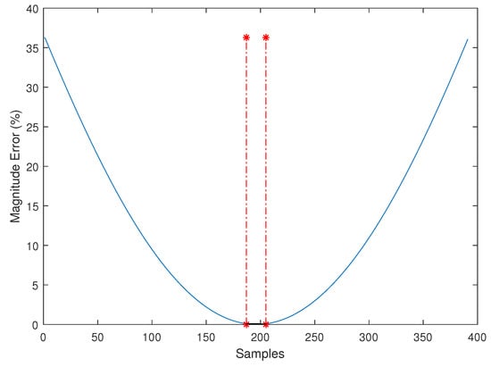 The vertical axis error percentage is the result of the corresponding horizontal axis changing from M− 0.5 to M + 0.5. Since the signal magnitude is known, the optimal condition is to achieve 0% magnitude error. Indeed, the minimum of the magnitude error achieves 0.0002% only when the frequency is close to 996.1 Hz. The maximum percentage of the magnitude error is more than 35%, and only the samples of M between the very slim region formed by these two dotted lines achieves a magnitude error percentage smaller than 0.1%.