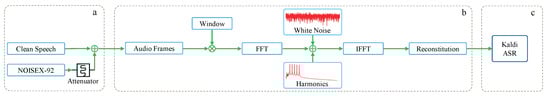 The block diagram of the verification experiment is illustrated in Figure 5. The experiment includes an utterance generation module, a simulated DUT and a Kaldi ASR system, which corresponding to the part ‘a’, ‘b’ and ‘c’ in Figure 5 respectively. The utterance generation module attenuates the white noise, babble noise and factory1 noise from the NOISEX-92 noise library by an attenuator according to the specified SNR, and then superimposes them on the clean speech, respectively []. The clean speeches are 10 short (each is about 10 s, all are 16 kHz sampling frequency and 16-bit sampling resolution) segments from a male. The simulated DUT distorts the input speeches according to the corresponding frequency response. For clarity of contrast, the simulated DUT ensures that the DUTs have harmonic distortions of the same relative magnitude at any non-zero input signal frequency. The phases of distorted spectral components are the same as the fundamental spectral components. Each output frequency of the simulated DUT is equal to the summation of the input signal and the distorted spectral components at this frequency. The ASR system consists of an open-source ASR toolkit Kaldi [] and a Mandarin TDNN chain model CVTE trained on commercial data.