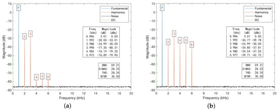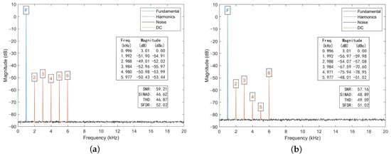 Output spectrum of DUT in situation B. (a) DUT5. (b) DUT6. Test signal: 996.1 Hz, 2 ; Band: DC-20 kHz; Sampling frequency: 40 kHz; Sampling points: 2048; Spectrum averaged times: 100; Kaiser window ().