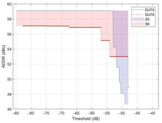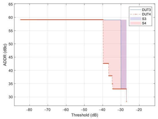 Taking the comparison of two DUTs as an example, the ADDR plots of these DUTs are illustrated in Figure 2a. There are two basic rules: (a) Corresponding to the same ADDR on the vertical axis, the smaller the value of the threshold on the horizontal axis is, the better the DUT performance is. This is reasonable because for a same ratio of signal to specified distorted spectral components, a lower threshold represents a larger clearance area near the fundamental signal. (b) Corresponding to a same threshold on the horizontal axis, the larger the value of the ADDR on the vertical axis is, the better the DUT performance is. Because for the same threshold a higher ADDR value represents a larger ratio of signal to specified distorted spectral components.