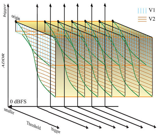 For the DUTs with different maximum thresholds, projecting onto the right vertical reference line is equivalent to horizontally extending the ADDR plot of the corresponding DUT with a smaller minimum threshold in that direction. This is reasonable because in the spectrum if the position of the threshold is higher than the maximum of distorted components, the ADDR result is unchanged. The projection onto the left vertical reference line is to make the comparison process meet the set rules.