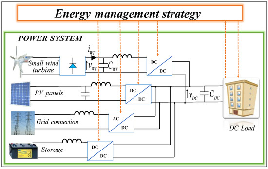 The research community is still exploring all possibilities to provide an alternative to traditional energy resources based on fossil fuels in order to reduce environmental issues such as greenhouse gas emissions and global warming [1]. In this context, the use of renewable energy resources has significantly increased in recent decades with more intention to integrate them in the utility grid [2]. For this reason, the smart grid has been created and developed to manage renewable energy resources in the utility grid. The smart grid is a new electricity transport and distribution network that allows a bidirectional communication between suppliers and consumers in order to adjust the flow of electricity in real time and enables more efficient management of the electricity grid [3]. The main components of the smart grid are microgrids (MGs). Indeed, an MG is based on the idea of providing electrical energy in a decentralized form: it combines loads, storage and multiple energy sources (traditional and renewable) in one unique entity. The MG is able to operate on-grid and off-grid. Thus, it is suggested to facilitate the realization of the smart grid, supply isolated areas, ensure power balancing and promote local energy consumption and production [3,4]. There are three different structures of MGs depending on the common bus, i.e., DC or alternating current (AC), of its different components: AC MG, DC MG and hybrid AC/DC MG [5]. While the AC MG has been the subject of remarkable dynamic research for enhancing its performance, several works have presented the attractive uses of the DC MG thanks to its high efficiency to integrate DC native renewable energies.