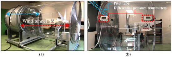 (a) Wind tunnel; (b) pressure transmitters and Pitot tube.