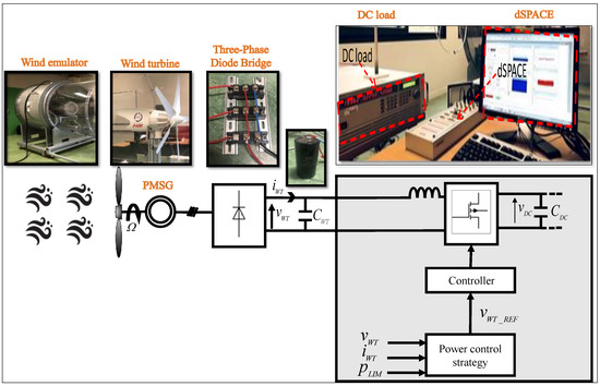 The SWECS investigated in this study is based on a three-phase diode rectifier to convert AC voltage obtained from the PMSG to DC voltage (Figure 3). A smoothing capacitor is used to constitute the DC bus of the SWECS. Then, a controllable DC/DC converter with a controller bloc, where the algorithms are implemented and which is driven by dSPACE, is designed to adjust the desired power and reach the operating point. Finally, to emulate the MG load demand, a programmable DC electronic load is used. Thus, the power required by the MG load or the user, , and the DC bus voltage, , are used as parameters for algorithms which aim to manage the electrical power available in the DC bus (). The result provided by the controller is .