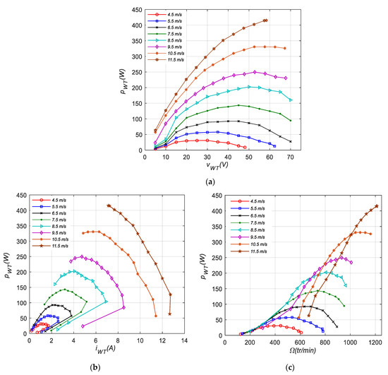 Prior to investigating different power control strategies, several tests are carried out within the wind tunnel by changing the load and the wind speed. The voltage, the current and the electrical power in the DC bus are then measured. In addition, the mechanical speed () of the PMSG is observed and measured in order to not exceed the maximum value recommended for this WT. Collected experimental data are given in Figure 4.