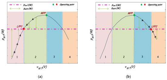 When the SSWT converter operates in LPPT mode, the is under maximal value, which means that the user or loads ask for less power. Therefore, to function correctly in LPPT mode, the absolute value of the difference between and should be calculated as . This must be low in order to reach the operating point. For this reason, algorithms used in the LPPT control strategies aim to decrease the value of as much as possible. Overall, in LPPT mode, two limited power points (LPP1 and LPP2) could be achieved by reducing . Consequently, the curve is divided into four regions, which are characterized by different conditions (see Figure 6), allowing the transition from one operating point to another according to the needs of the user and the constraints of the used equipment. Thus, it is crucial to make a wise choice based on the advantages and disadvantages of each point. To avoid the generator’s over-speeding and minimize the mechanical stress, the proposed power control strategies should seek LPP1, whereas LPP2 ensures less power loss and low currents. In this study, the limits of the test bench equipment restrict the WT system to operate at a specific point. In this context, the characteristics of the SSWT used in this study (Figure 4a,c) show that for high wind speeds, the system can operate only in LPP1. Indeed, the rotor maximum rotation speed estimated at 1250 rpm can be exceeded while trying to reach the second point LPP2, which can damage the WT.