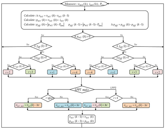The selected controller in this present study is P&O, which is very simple and allows for a fast dynamic in tracking the operating power points. It does not require knowledge of SWECS components. It consists of perturbing the operating voltage of the system and analyzing the resulting change of power to decide the direction of the next perturbation. The P&O principle is used and presented in Figure 6. It is different from the flowchart for classical P&O [11] because it takes into account two operating points. Thus, several conditions were analyzed in order to identify the four regions (r) presented in Figure 5. The value of is calculated following the conditions in Figure 6. This flowchart measures at each k instant the variables and , calculates and , and then compares them with powers calculated at the instant: and . Three LPPT control strategies based on P&O are presented below.