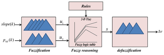 The variable step size based on the FL method is gaining popularity as a method for the MPPT technique. It was used by many authors [17] to extract the maximum power thanks to its fast convergence and handling the non-linearity of the system. However, few studies have been carried out using this method to investigate the WT’s performances when limited power is required [34]. The FL method consists of mapping the input space and the output space through logical operations. This method’s realization process is divided into three steps: fuzzification, fuzzy reasoning and defuzzification [8] (Figure 7). In order to calculate the variable step size, the inputs here are the slope ()and . They are converted, during the fuzzification process, into fuzzy linguistic sets using the Mamdani method [8] and the universe of discourse of the inputs and the output is normalized into [–1, 1]. Thus, is the first normalized input corresponding to () and is the second normalized input corresponding to . These fuzzy sets are then analyzed by the fuzzy reasoning surface where a fuzzy output s is obtained by using fuzzy rules. To simplify the study, forms of membership function were selected as triangular and trapezoidal. Furthermore, the defuzzification process converts this fuzzy output to the desired output value and the operator used in this study is the center of gravity. The FL controller presented in this study allows for examining the first input and, if this value is greater than zero, the step size increases until the LPP is reached. If it is less than zero, the opposite occurs until the operating point is reached. The second input is then used to adjust the value of the step size and determine the region of the operating point.