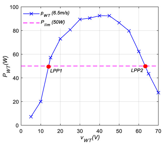 In order to demonstrate the effectiveness and applicability of the proposed power control strategies, algorithms were performed using MATLAB Simulink. At first, the simulations were carried out to investigate the performances of the WT under varying step sizes for each algorithm. Due to the constraints linked to the characteristics of the WT studied in this work, two points, LPP1 and LPP2, allow for reaching the same power for a specific wind velocity. They are examined in Figure 8. Thus, the wind speed is fixed at 6.5 m/s and the limited power () at 50 W, which is under the maximal power provided in this case. After studying the performances of each proposed control strategy, a comparison of the results with a specific step size is carried out.