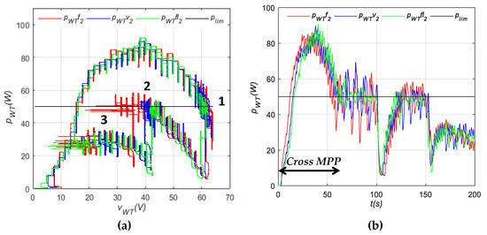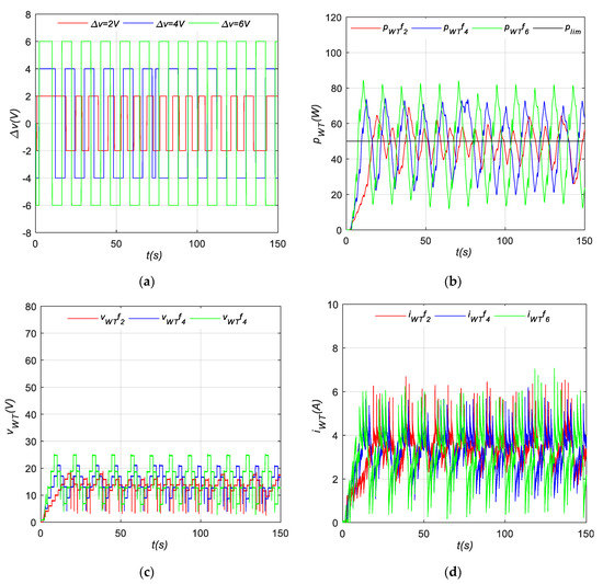 It can be obviously observed in the figures that according to the voltage perturbation step size, the results are not similar. Indeed, increasing the step size leads to a faster response with more power oscillations around the and, hence, less efficiency. In contrast, a smaller step size enhances efficiency, but reduces the convergence speed. This is in agreement with the results found in the literature [35,36]. In addition, comparing LPP1 and LPP2 reveals that working in LPP2 point leads to more power oscillations around the . This could be related to the rotor speed, which is less braked in LPP2, inducing an increase in the voltage and the rotor speed and thus generating more power oscillations compared to LPP1.