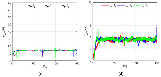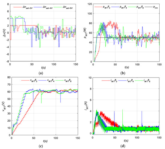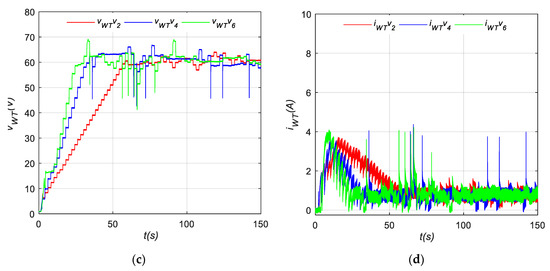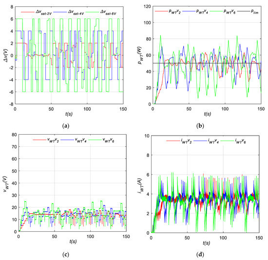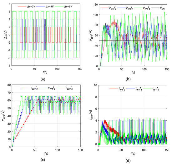 Figure 9 and Figure 10 present the experimental results of P&O with three different fixed step sizes (2, 4 and 6 V) to target LPP1 and LPP2 for a wind speed of 6.5 m/s. As can be seen in these figures, the power generated () for different fixed step sizes is oscillating at around 50 W for both LPP1 and LPP2, whereas the voltage () varies close to 15 V and 60 V for LPP1 and LPP2, respectively. This corresponds to the selected case (see Figure 8). In addition, during the transition from LPP1 to LPP2, the current decreases approximately from 3.5 A to 1.5 A (Figure 9d and Figure 10d).