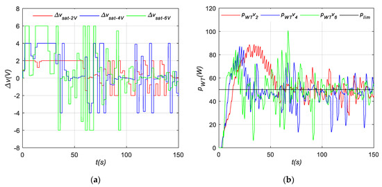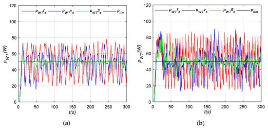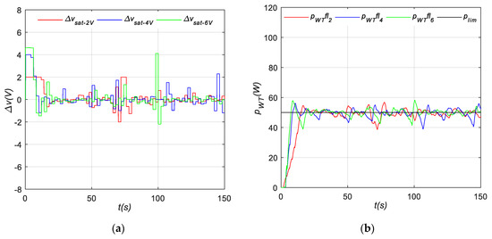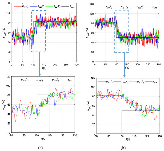 The change of power represents a frequent situation in LPPT mode. Figure 17a,b depict two cases of a sudden variation of power, i.e., the sudden increase and decrease in power. The selected and correspond to 50 W and 82 W, respectively. For both cases, the wind speed is maintained constant at 6.5 m/s. It can be clearly observed in the case of a sudden increase and decrease in power that all power control strategies operate successfully with a difference in terms of oscillation as described previously. The required time to make a transition to the new operating point is almost the same for all power control strategies. However, the decrease in power requires more time than the increase in power. It means that the increase in power from to needs 13 s, while it takes place within 20 s in the opposite case. It is important to also note that the FL technique stabilizes quickly compared to the fixed step size and Newton’s methods in the case of an increase and decrease in power.