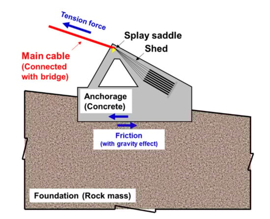 In a ground-anchored suspension bridge, the anchorage performs the function of supporting the tension force acting on the main cable. As one of the construction methods of anchorage, gravity-type anchorage (GTA) (see Figure 1) is widely used due to a variety of advantages such as simple mechanical configuration, ease of construction, and its vast applications [1]. The GTA resists the cable load via the weight of the anchorage structure itself, and this depends on the frictional resistance between the anchorages (concrete) and the foundation (rock). For designing the GTA, many guidelines are recommended to assess the stability of a GTA using the gravity method [2,3,4,5,6], and it is coupled with the Mohr–Coulomb (M-C) criterion, which is defined by several parameters such as friction angle and cohesion. However, some guidelines assume the M-C parameters to be a conservative constant value (e.g., and ) [5,6] in the vicinity of the joint between the anchorage and the foundation. The rough geometry of the joint is also neglected in the gravity method. Such oversimplifications related to joint properties may lead to a conservative stability analysis, and it may require a huge amount of earth and rock excavation and concrete consumption, which may result in high construction costs and environmental damage in GTA. Therefore, it is crucial to extensively investigate the frictional resistance and failure behaviors around the joint structure between concrete and rock surfaces (i.e., concrete–rock joint) with rough geometry under shearing.