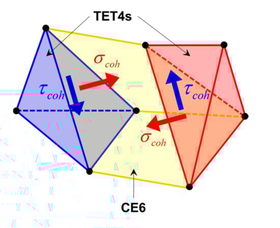 The fracturing in the rock and concrete are modeled by an intrinsic cohesive zone model (ICZM) with the concept of smeared crack [55] representing opening and sliding cracks as well as mixed-mode I–II fracturing. In this model, 6-node initially zero-thickness cohesive elements (CE6) are inserted into all the boundaries of the TET4s at the beginning of the FDEM simulation to model the fracture of the rock and concrete (Figure 2). The opening and sliding of the faces in each CE6 are governed by tensile and shear softening curves as a function of the crack opening () and sliding displacements () (Figure 3). In the tensile and shear softening curves, the normal and shear cohesive tractions (i.e., and , respectively) acting on each side of CE6 are calculated using Equations (1) and (2), respectively: