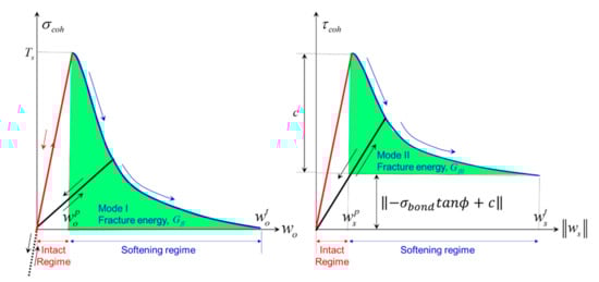 where and are the artificial elastic limits of and , respectively. is the representative overlap controlling the artificial elastic behavior of CE6s when o is negative, i.e., overlapping. , c, and are the microscopic tensile strength, cohesion, and internal friction angle, respectively, of the CE6. The , , and are defined as , , and , respectively, where is the element length, and , and are the artificial penalty terms of the CE6 for opening, sliding, and overlapping, respectively. Equation (2) corresponds to the Mohr–Coulomb (MC) shear strength model with tension cut-off. The function is the characteristic function representing the tensile and shear softening curves (Figure 3), and it changes according to a damage value of CE6. The damage value is used to consider not only the opening and sliding of the faces of CE6 but also mixed-mode fracturing using the equation below [55]: