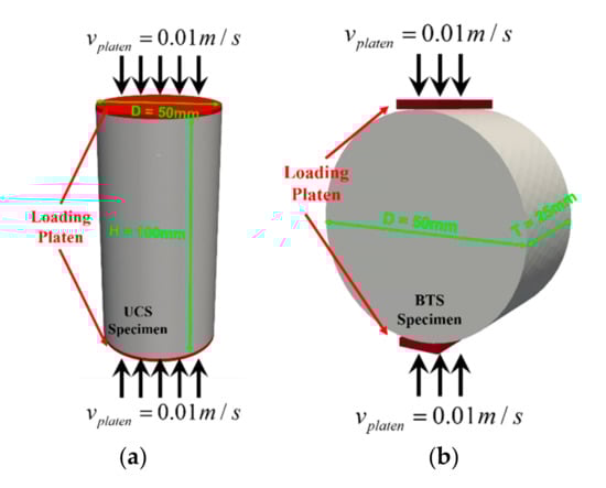 FDEM simulation models used for calibrating the input parameter in combined FEM (a) uniaxial compressive strength (UCS) test; (b) Brazilian tensile strength (BTS) test.