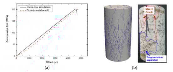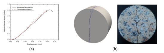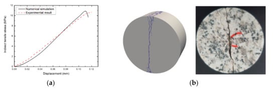 Comparison of FDEM numerical simulation and experiment of the BTS test of concrete under quasi-static loading: (a) plot of axial stress versus axial displacement and (b) final fracture pattern from the numerical simulation and experimental test.