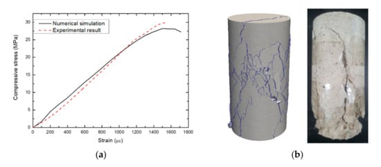 Comparison of FDEM numerical simulation and experiment of the UCS test of concrete under quasi-static loading: (a) plot of axial stress versus axial displacement and (b) final fracture pattern from the numerical simulation and experimental test.