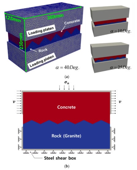 In this section, the 3D FDEM was employed to model the asperity dilatation, sliding, and degradation during the direct shear test of a rough C-R joint. As shown in Figure 9a, the 3D FDEM model has been generated and originally adopted as the direct shear test specimen. To compare the numerical simulation result with the direct shear test result, a simulation model was generated as an equivalent dimension on the experimental specimen. To consider the effect of asperity roughness of the C-R joint, we prepared three direct shear test models having the asperity angles of α = 40, 25, and 10 degrees (see Figure 9a). Note that the asperity angle is defined as the angle from the specimen base to the inclined plane. There is no suggested method or standards for the direct shear test of the C-R joint. The size of the direct shear test specimen was determined by considering the International Society for Rock Mechanics and Rock Engineering (ISRM) suggested method for the direct shear test of rock, which is presented in this literature [56]. Based on the ISRM suggested method, the test plane of the rock specimen should be exceeded by 10 times the maximum of the asperity height. In this study, we determined the asperity height between 5 and 25 mm, and the specimen width, length, and height were determined as 125 mm, 300 mm, and 230 mm, respectively. The FDEM model consists of discrete 35 MPa concrete and granite blocks. Both the concrete and granite blocks have a saw-tooth shape at the one end of each block. Along the saw-tooth shaped ends, the two blocks are placed in a way that each end perfectly matches to form the C-R joint. To apply normal and shear loadings to the blocks with the rock–concrete joint, we considered two half-boxes (hereafter called loading platens) partially covering the concrete and granite blocks (Figure 9b).