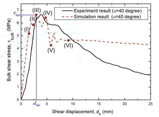 Shear stress vs. shear displacement curve obtained during the simulation of a direct shear test with rough concrete–rock joint fracture process with an asperity angle α = 40 degrees (σn = 3 MPa).