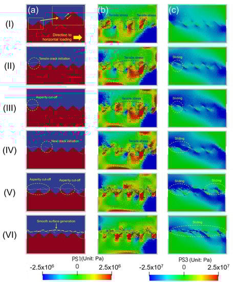 The simulated fracture process in the shear test with the rough concrete–rock joint with an asperity angle α = 40 degrees. (a) Temporal change of distribution of maximum principal stress (PS1), (b) Temporal change of distribution of minimum principal stress (PS3), (c) The fracture process showing the development of macroscopic fracture surfaces.