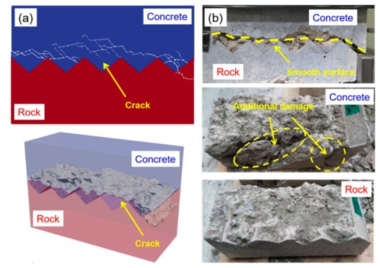 A comparison of the resultant fracture pattern in the shear test with the rough concrete–rock joint in the case of an asperity angle of α = 40 degrees: (a) numerical simulation and (b) experiment result.