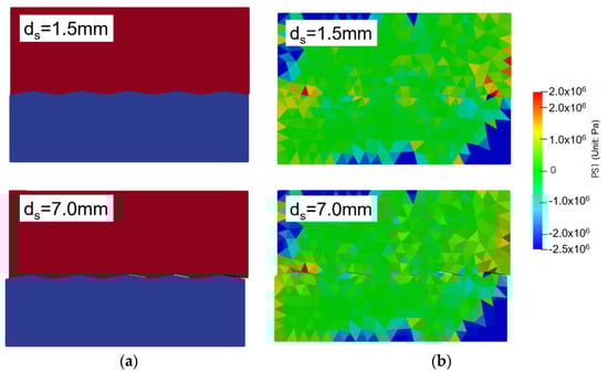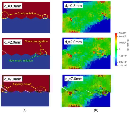 Simulation results in the shear test with a relatively smooth concrete–rock joint for the cases of asperity angles α = 10 degrees. (a) Macroscopic crack, (b) maximum principal stress distribution (PS1).