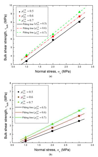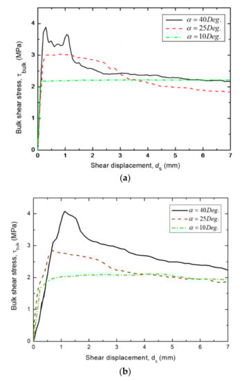 As can be seen in the Figure 17, the τbulk is presented as a function of σn in terms of different (i.e., = 0.5, 0.6, and 0.7) and α (i.e., α = 10 and 40 degrees). Figure 17 shows that the bulk shear strength increases with increments in both α = 10 and 40 degrees. In Figure 17a,b, the bulk may be more dependent on the in the α = 10 than 40 degrees because the bulk was almost constant with the α = 40 degrees, while the bulk increases with the friction coefficient increment in the α = 10 degrees. Sliding is the main mechanism in the smooth joint (i.e., α = 10) and the directly increased the friction as well as the bulk shear strength at the concrete–rock joint. The asperity degradation occurs in the rough joint (i.e., α = 40) in the vicinity of the concrete asperity base. The friction applied at the macroscopic crack in the concrete part and bulk may be independent with the variation of .