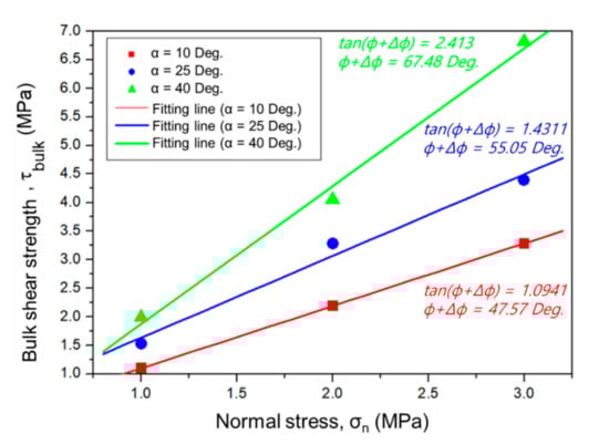 To interpret the obtained results more clearly, the FDEM simulation results for various values of α (α = 10, 25 and 40 degrees) and σn (i.e., σn = 1.0, 2.0 and 3.0 MPa) were fitted using a linear fitting line based on the M-C shear failure criteria as shown in Figure 16. To avoid confusion caused by notation between the microscopic cohesion and internal friction angle, which is summarized in Table 2, and the parameters of the M-C shear failure criteria, the M-C parameter is presented as the bulk cohesion (cbulk) and bulk internal friction angle (bulk). In addition, the cbulk and bulk reflect the overall shear resistance in the vicinity of the C-R joint, unlike the microscopic cohesion and internal friction angle represented in a single material. In this figure, the shear strength for each case was computed as the peak value of each of the τbulk−ds curves for different conditions. In this M-C shear failure criteria, the bulk cohesion (cbulk) is considered as zero because of an unbounded condition between the concrete and rock surface. In addition, the bulk internal friction angle (bulk) was determined by calculating the slope of each linear fitting line. The figure clearly shows that the increase in normal stress increments based on the M-C theory and the internal friction angle (bulk) also increased with asperity angle increments. These simulation results follow Patton’s theoretical model [10], which represents the effect of joint roughness as the increment of the internal friction angle, , (e.g., ) when the asperity angle, i.e., joint roughness, increases. Ultimately, such results validate the applicability of the 3D FDEM to this class of problem involving joint surface interaction.