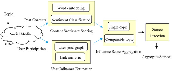 In the proposed stance extraction method, there are three major components: content sentiment scoring, user influence estimation, and influence score aggregation. The architecture of the proposed approach is illustrated in Figure 1.