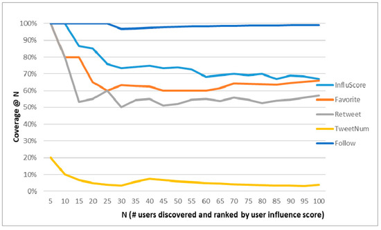 As shown in Figure 6, the best performance can be achieved with the edge weighting of Test1 since it can cover more Twitter authenticated users. To get better performance, the weighting of sharing should be higher than posting, but the weighting of posting cannot be too low. A small percentage of weighting for retweeted and shared can improve the accuracy. Also, since there might not be many retweets, retweeting weight should not be too high. To further verify the effect of influence score on finding the top users, we compared it with the number of followers, retweets, and favorites as in Figure 7.