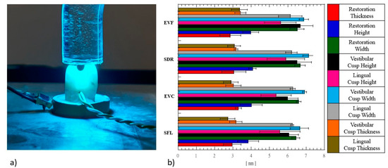 Teeth were subjected to Class II MOD cavity preparation, and dimensions were 3-mm intercuspal width and 4-mm depth in occlusal box. Cavities were realized with a diamond bur mounted on the turbine Fona8080 (Fonadental, Assago, Italy) on a high-speed contra-angle. Teeth cusps and restoration MOD cavity dimensions are reported in Figure 1b.