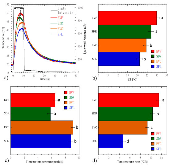 (a) Temperature profiles developing into bulk-fill RBC; (b) maximum temperature rise; (c) time to temperature peak; and (d) temperature rate. Error bars represent the standard deviation. Different letters reported beside the bars indicate a significant difference between the means (p < 0.05).