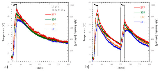 Simultaneous time measurements of temperature and photo-diode signals for MOD cavities restored with the four bulk-fill RBCs according to the layering technique are reported in Figure 3. For both the bulk-fill (Figure 3a) and incremental layering (Figure 3b) techniques, a steep temperature profile is detected as the light is turned on. For flowable RBCs, the temperature decreases as the light is switched off. Instead, for packable RBCs, a delay is observed in the peak temperature for the bulk-fill technique (Figure 3a), and in the second peak temperature for the incremental layering technique. Maximum peak temperature values were recorded for the flowable EVF and SDR composites (43.9 °C ± 1.8 °C and 42.9°C ± 1.7 °C, respectively) as the incremental layering technique was performed to restore the MOD cavities.