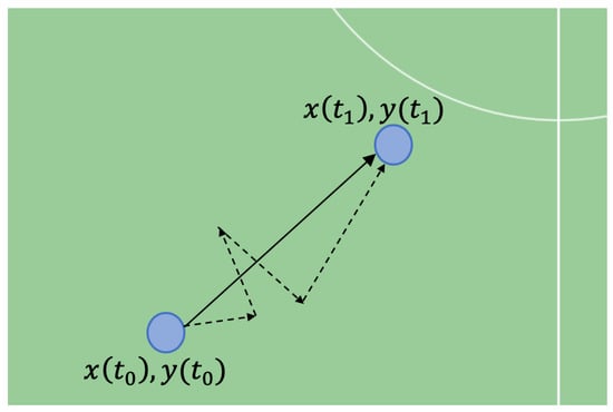 In our work, we are only interested in the basic approximation of actual player movements. We divide an input game segment into equal intervals of user-specified duration and calculate player velocity components and using Equations (1) and (2) according to their positions , at the beginning and end of each time interval . Note that this approach represents player movements with straight lines, approximating the general trajectory (see Figure 1):