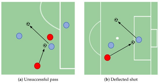 - Unsuccessful pass event. A player tried to make a pass to an identified receiver, then the ball left the field or was intercepted by the other team. Note that “clearance” events (when the players kick the ball away from their own goal line) often fall into this category;