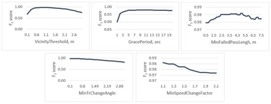 The evaluation routine (the source code for event recognition and parameter tuning is available at github.com/vi3itor/soccer-event-recognition) allows us to make the following observations (see Figure 3). Any choice of and within the test ranges have virtually no effect on the resulting performance. The optimal value of is approximately 0.1, all higher values cause errors in pass events recognition. The optimal values of and are achieved inside their respective ranges and any deviation from the optimum increases recognition errors. On the other hand, nearly optimal results (with score higher than 0.9) are obtained on a wide range of values. The optimal choice of parameters is provided in Table 4.