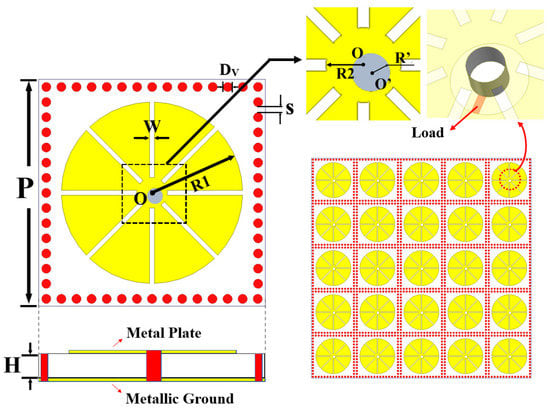 The dielectric substrate had a thickness of 0.8 mm, a dielectric constant of 2.65, and a loss tangent of 0.0012. The top and bottom metal planes were copper foil, with a conductivity of 5.8 × 107 S/m and a thickness of 0.035 mm. The dimensions of the unit cell were as follows: R1 = 5.8 mm, R2 = 1 mm, R’ = 0.6 mm, W = 0.3 mm, Dv = 0.6 mm, S = 0.6 mm, H = 0.8 mm, and P = 15 mm.
