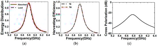 The absorbed EM energy, the energy distribution on the load, and the harvesting efficiency of the metasurface at a normal incidence were analyzed. It can be seen from Figure 2a that the metasurface had the maximum absorption efficiency at 5.8 GHz. The absorption and harvesting efficiencies were 96% and 91%, respectively. Only 5% of the energy was dissipated in the substrate and metal, and most of the energy was harvested by the resistor, which indicates that the metasurface can effectively collect EM energy. Figure 2b shows the harvesting efficiency of the TE and TM polarizations, which were basically the same. The arbitrary polarization wave could be deconstructed into two orthogonal polarizations of TE and TM waves so that a similar efficiency would be obtained for an arbitrary polarization at the normal incidence. Thus, the metasurface was insensitive in polarization. As shown in Figure 2c, the harvester performed well with low cross polarization, measuring below −20 dB at 5.8 GHz, which means the energy could be harvested simultaneously and separately by these two orthogonal polarizations.
