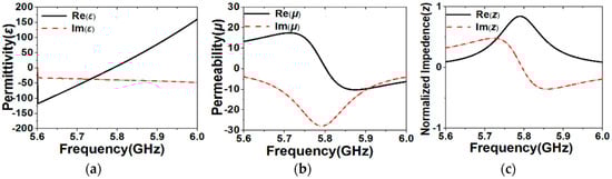 The absorption principle can be explained by the impedance matching between the free space and the metasurface interface. The effective parameters were extracted from the complex scattering parameters by the standard retrieval procedure []. As shown in Figure 3, the extracted permittivity and permeability at the resonance frequency were (4.42-j63.4) and (4.44-j44.60), respectively. The normalized impedance (), compared with that of the free space (377 Ω), was (0.84-j0.01) Ω. Thus, the metasurface was a good match with the free space, and reflections at the metamaterial interface would be very small.