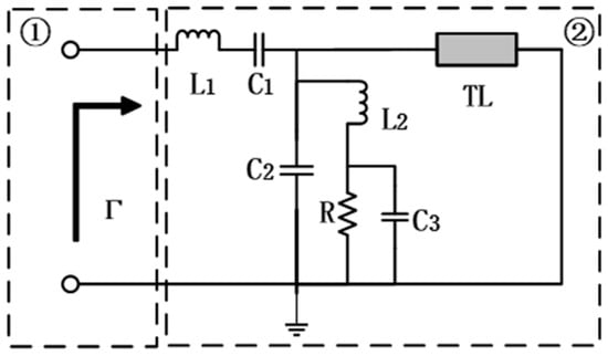 The operation mechanism of the metasurface can be analyzed by the equivalent circuit approach. The transmission line equivalent circuit of the proposed metasurface is shown in Figure 4. Part 1 represents the incident plane wave from the free space, which had a wave impedance of 377 Ω. Part 2 is for the metasurface. C1 and L1 represent the total capacitance between each of two sectors and the total inductance of the eight sectors, respectively. C2 and L2 represent the capacitance between the unit pattern and the metallic ground and the inductance of the metal via near the center, respectively. R is the harvesting load, and C3 represents the capacitance between the via and the ground. The substrate between the unit pattern and the ground can be modeled as a transmission line, with a characteristic impedance of 377/ = 231 Ω.