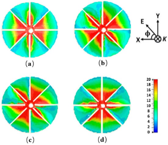 To analyze the polarization insensitivity feature, the surface current of the metasurface unit cell was explored. Figure 6a shows the current distribution of the TE wave at the normal incidence, and Figure 6b–d show the surface current with the polarization plane being rotated by 30°, 60°, and 90° along the xoy-plane, respectively. For any polarization angle, the current always passed through the circle in the center, and the harvesting load was placed at the concentrated point of the current, which was the criterion of determining the harvesting load position. What is more, the current distribution density and pattern stayed relatively unchanged, due to the approximate symmetrical pattern of the unit. Therefore, the unit cell could effectively harvest the energy and maintain a high efficiency for arbitrary polarization waves at the normal incidence.