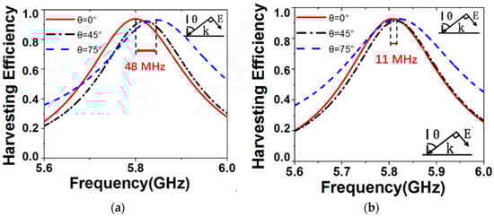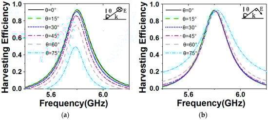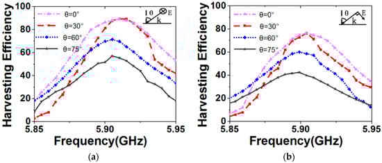 The harvesting efficiency of the metasurface under an oblique incidence for TE and TM polarizations was studied. Figure 7a shows the efficiency for TE polarization. As the incidence angle increased from 0° to 75°, the operation frequency in the broadside direction was nearly unchanged, and the harvesting efficiency reduced gradually. When the incident angle increased to 60°, the harvesting efficiency was 72%. For TM polarization, as the incidence angle increased from 0° to 75°, the operation frequency in the broadside direction shifted by only 11 MHz. When the incidence angle was 60°, the harvesting efficiency was 91%, as shown in Figure 7b. The simulated results show that the metasurface can maintain a high efficiency at a fixed frequency over a wide range of incidence angles, and it remains insensitive to polarization, even in the case of an oblique incidence under 45°.