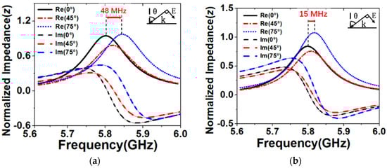In this design, a square-shaped metal via ring around the unit cells is proposed to decrease the mutual coupling and improve the frequency stability. Figure 8 shows the impedance for TM polarization versus the frequency with and without the square rings when the incident angles are different. It can be observed that the relative impedance shifts with the frequency as the incident angle increasing. When the incidence angle increases from 0° to 75°, the frequencies shift 15 MHz and 48 MHz with and without the square rings, respectively.