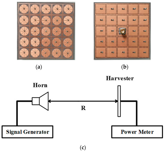 To experimentally validate the energy harvesting efficiency of this metasurface, we fabricated a 5 × 5 array, as shown in Figure 10a,b. A horn antenna was fed by a signal generator and illuminated the metasurface with a distance of R. Power was delivered to the central unit cell and measured by the power meter. The far field distance of R was defined according to the aperture of the horn. The experiment setup is shown in Figure 10c.