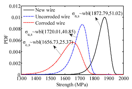 To model the cable strength degradation model, an experimental study on the strength of corroded cables with a service time of 20 years was considered [28]. Figure 1 presents the probability density function (PDF) of the cable strength of three types of short wires, including a new wire, an uncorroded wire, and a corroded wire. It can be observed that the mean strength value of the corroded wire was the lowest. In addition, the shape of the distribution changed significantly due to the corrosion-fatigue effect.
