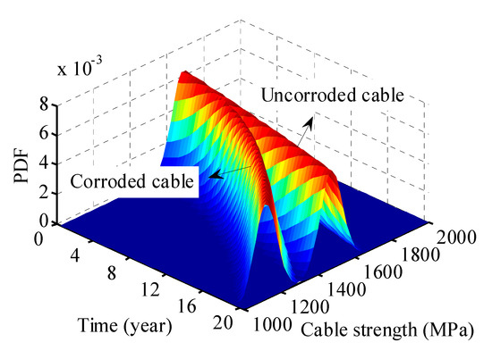By combining the PDFs of different wires (as shown in Figure 1), the time-varying PDF of the cable strength can be estimated. Therefore, based on Figure 2 and Equations (7) and (8), the time-varying PDFs were obtained (as shown in Figure 3). As it can be observed in Figure 3, the probabilistic characteristics of the corroded and uncorroded cables were totally different. The corroded cable exhibited a severer downward tendency, while the uncorroded cable presented a slight downward tendency. This phenomenon demonstrates that corrosion is a critical factor that should be taken into account in probability modeling of the cable strength. Moreover, the degradation model can be utilized for the time-varying reliability analysis of a cable-supported bridge. The analytical results can be the theoretical basis for cable replacements.