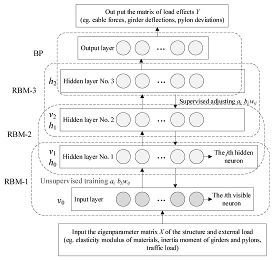 In general, a DBN is a new type of generative neural networks which are constructed by stacking restricted Boltzmann machines (RBMs) that are usually trained based on the probability principle [29]. In a DBN, the RBMs are connected between hidden and visible layers. In the visible layer, the nodes are connected without directions. In the pre-training stage, the main training strategy is unsupervised learning, where the fine-tuning stage is trained by a supervised learning method. The outputs of a visible layer are treated as inputs to the hidden layer. In general, DBNs are widely used in the field of image identification. Their application in structural reliability analysis is relatively insufficient. In this study, the DBN and BP networks were utilized to approximate the structural response surface functions. The framework of predicting the effect of structural load effect using the DBN is shown in Figure 4. The DBN principle will be demonstrated below.