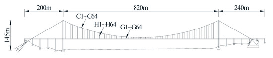 The prototype bridge used in the present study is the Nanxi Yangtze River Bridge, which is a suspension bridge in the Luyu highway of China. The general arrangement and the serial number of each component are shown in Figure 6. The main cable is composed of parallel wire strands, the stiffening girders are steel box girders, and the pylon has a concrete box section. According to the construction sequence, the suspenders, main cables, and girders are divided into 64 segments. Details of the bridge characteristics can be found in Lu et al. [1].