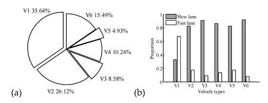 Proportion of vehicles (a) Vehicle types; (b) driving lanes.